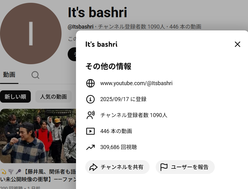 藤井風さんの2025年紅白歌合戦出場辞退に関する動画をアップしているチャンネルが4つほどでてきたので、だれが発信しているのかを確認してみました。下の画像はそのうちの一つのチャンネル情報です。