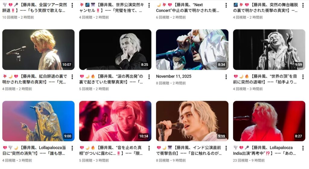 やはりYoutubeチャンネルだけに発信者の説明は全くなく、匿名同然でした。しかもアップされている動画のほとんどが藤井風さんに関するスキャンダラスな内容です。